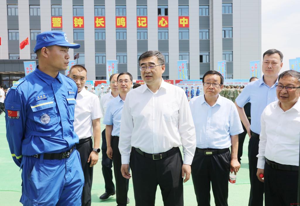 檢查消防救援大隊(duì)、礦山救援隊(duì)和藍(lán)天救援隊(duì)的應(yīng)急裝備器材。范濤 攝