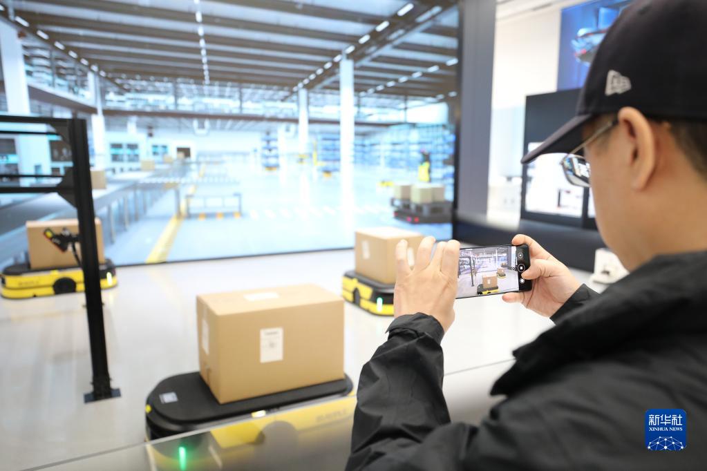 5月22日,參觀者在浙江大華技術(shù)股份有限公司的展廳內(nèi)拍攝一款智能運輸車。新華社記者 杜瀟逸 攝