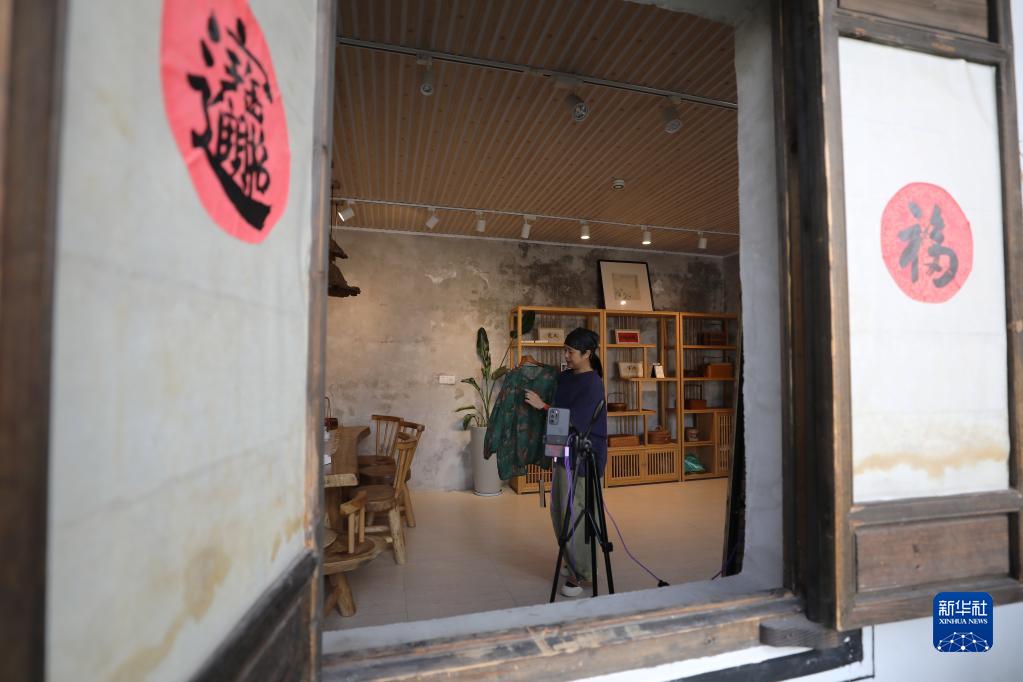 5月23日,在浙江省義烏市李祖村,創(chuàng)客鮑麗萍在店鋪里為網(wǎng)絡(luò)直播銷售做準(zhǔn)備。