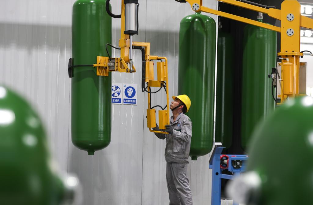5月31日,一名工作人員在江蘇國(guó)富氫能技術(shù)裝備股份有限公司的儲(chǔ)氫罐生產(chǎn)車間內(nèi)作業(yè)。新華社記者 楊磊 攝
