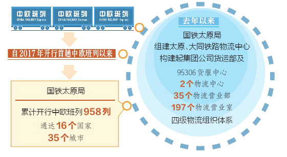 “自2017年開行首趟中歐班列以來(lái),國(guó)鐵太原局累計(jì)開行的中歐班列已有958列,通達(dá)16個(gè)國(guó)家、35個(gè)城市?!眹?guó)鐵太原局貨運(yùn)部科長(zhǎng)田源介紹,“中歐班列已經(jīng)成為不沿海、不沿邊的山西省對(duì)外開放重要平臺(tái)?!?/p>
