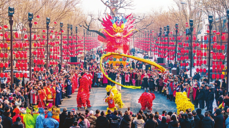 今年春節(jié),“夢回長平”不夜城街區(qū)以“炎黃子孫、龍行天下”為理念打造了浩大的龍燈燈會,598米長的金紅色巨型龍燈順著街區(qū)主干道起伏而上,龍頭栩栩如生、威風(fēng)凜凜,龍身通體華麗,穿梭于祥云之中。雖然這里主打的是夜經(jīng)濟(jì),為了讓游客們玩開心、玩盡興,“夢回長平”不夜城從上午十點半就開始推出不同主題的舞蹈、年俗展演等節(jié)目。