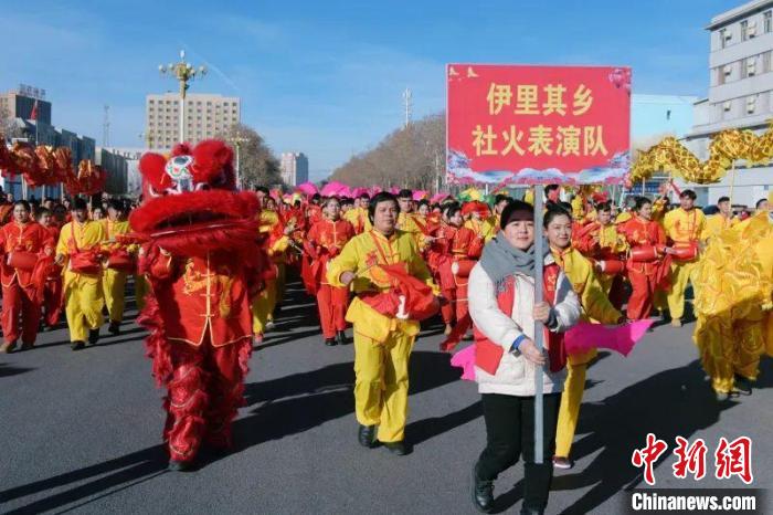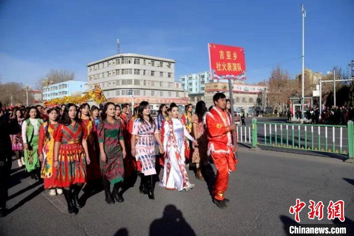 2月12日,農(nóng)歷正月初三,和田市舉行2024年“龍騰盛世·春滿萬家”社火活動(dòng),和田市伊里其鄉(xiāng)社火表演隊(duì)巡街。 張亞輝 攝