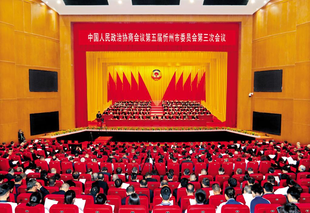 忻州大劇院大劇場布置簡樸,莊嚴(yán)隆重。會場內(nèi),燈光璀璨,氣氛熱烈。中國人民政治協(xié)商會議會徽懸掛在主席臺正中,十面鮮艷的紅旗分列兩側(cè)。會場后方高高懸掛著大紅條幅:以習(xí)近平新時代中國特色社會主義思想為指導(dǎo),推動中國式現(xiàn)代化忻州實(shí)踐邁出堅(jiān)實(shí)步伐!