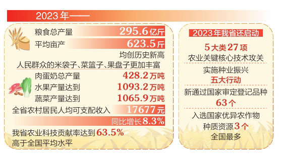 一分耕耘一分收獲。近年來(lái),我省糧食和重要農(nóng)產(chǎn)品生產(chǎn)穩(wěn)定、供給充足,農(nóng)業(yè)農(nóng)村現(xiàn)代化不斷邁出新步伐。2023年,糧食總產(chǎn)量295.6億斤,平均畝產(chǎn)623.5斤,均創(chuàng)歷史新高;人民群眾的米袋子、菜籃子、果盤(pán)子更加豐富,肉蛋奶總產(chǎn)量428.2萬(wàn)噸,水果、蔬菜產(chǎn)量分別達(dá)到1093.2萬(wàn)噸、1065.9萬(wàn)噸;全省農(nóng)村居民人均可支配收入17677元,同比增長(zhǎng)8.3%。這些成績(jī)的取得,得益于科技賦能助力。2023年我省農(nóng)業(yè)科技貢獻(xiàn)率達(dá)到63.5%,高于全國(guó)平均水平。