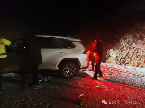 2024年11月25日晚18時,繁峙縣公安局指揮中心接到廣東游客趙岸華的報警求助電話,聲稱其一行四人駕車從河北來五臺山旅游,行至太行一號旅游公路神堂堡繁五交界路段時,因風(fēng)雪交加、道路結(jié)冰,車輛和人員被困。接到報警后,指揮中心立即通知神堂堡派出所和交警中隊前往救助。救援民警頂風(fēng)冒雪順著太行一號旅游公路沿路搜尋,經(jīng)過3個多小時的艱難跋涉,終于在神堂堡鄉(xiāng)盤道村往南約5華里的路上(已屬五臺山風(fēng)景區(qū)地界)找到了被困車輛。當(dāng)時該車燃油即將耗盡,車上四人凍得瑟瑟發(fā)抖,救援民警當(dāng)即將3名乘客轉(zhuǎn)移至警車上,并協(xié)助拖車司機將被困車輛連上拖車后原路折返,最終在11月26日凌晨2時將被困游客和車輛安全營救回派出所。