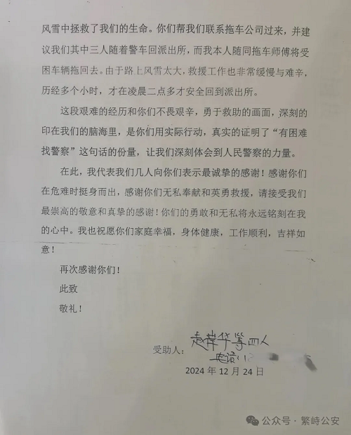 繁峙公安民警雪夜救援,司機千里寄信以示感激