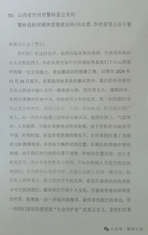 2025年1月1日,繁峙縣公安局收到了來自廣東省佛山市市民趙岸華等4人聯(lián)名寄來的感謝信,信中表達了對繁峙公安局神堂堡派出所民警頂風(fēng)冒雪深夜馳援,及時救助其脫險的感激之情。