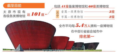 太原市充分發(fā)揮文物資源優(yōu)勢,將博物館作為文物保護利用改革的突破口,傾力建設(shè)凸顯地方文化特色的“博物館之城”。截至目前,太原市現(xiàn)有各級各類博物館達101座,包括41座備案博物館和60座類博物館,其中省屬一級博物館3座、市屬一級博物館2座。全市平均每5.4萬人擁有一座博物館,在中部6省省會城市中排名第一,遠超全國平均水平。