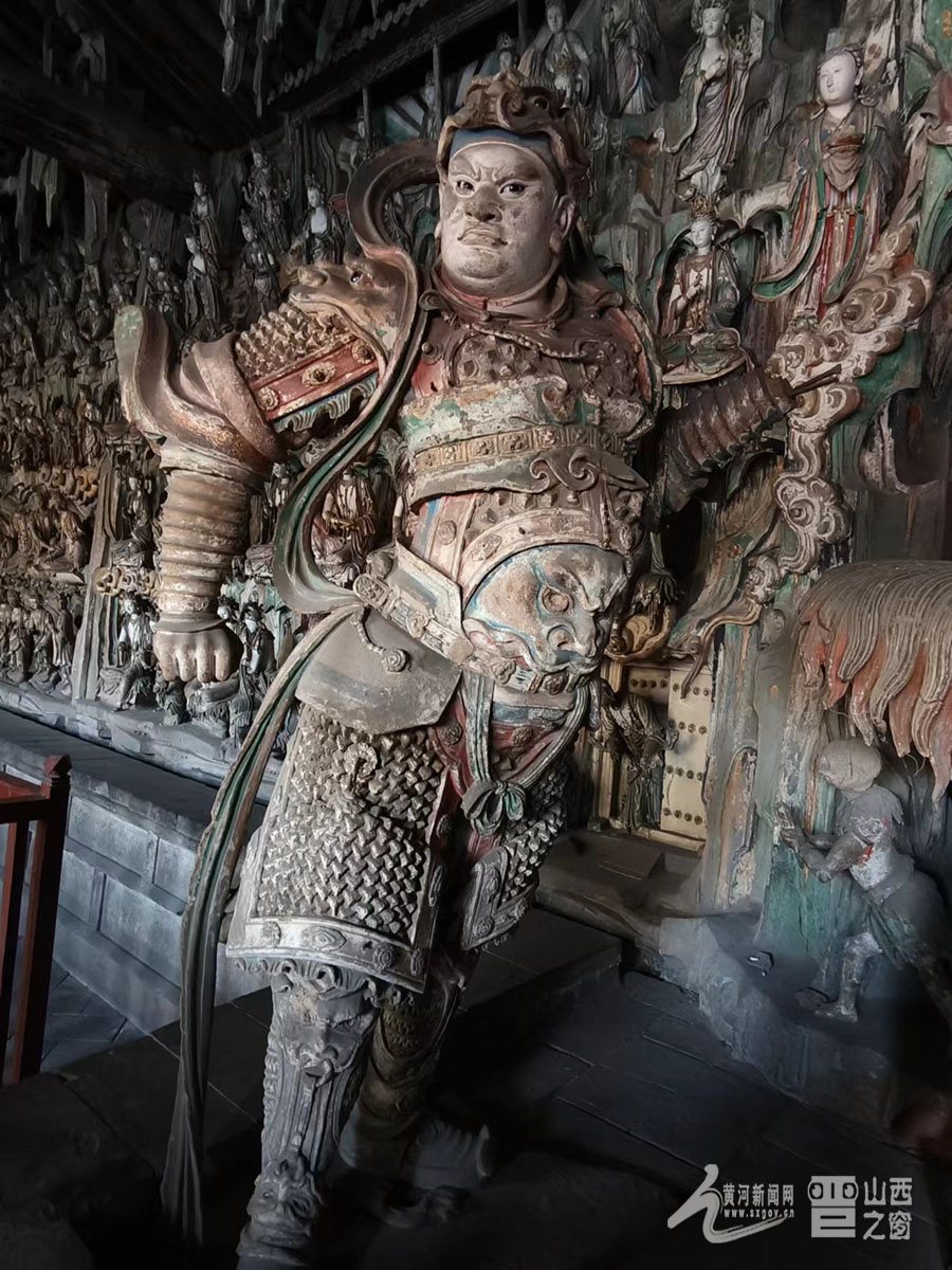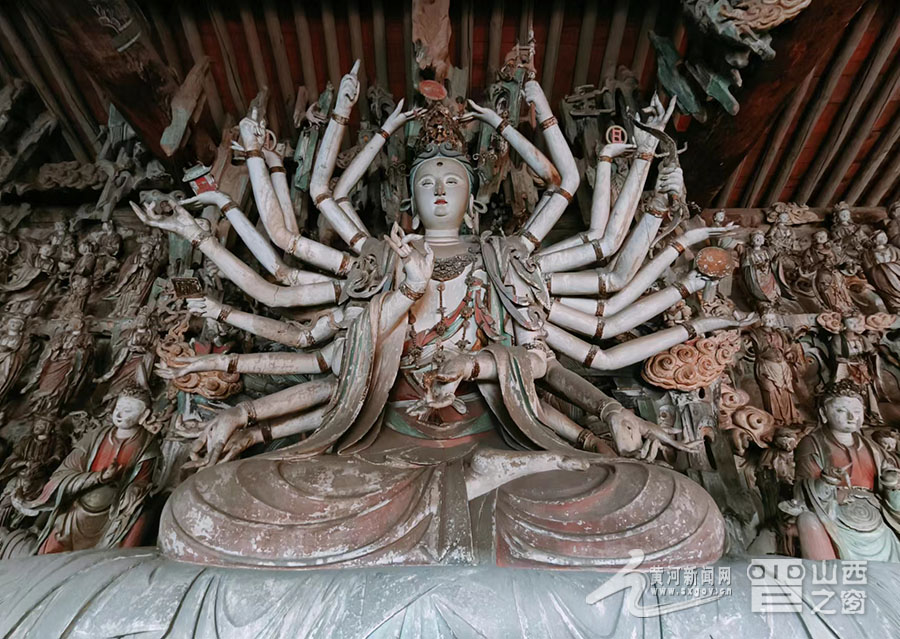 寺內(nèi)擁有總計2000多尊彩塑,大者丈余、小者尺許,每一壁龕為一獨立神話或佛教故事,人物造型生動,神態(tài)逼真,尤其以“千手觀音像”與“韋馱像”最為經(jīng)典。舞蹈《千手觀音》的靈感原型就是這尊千手觀音像。塑像高達(dá)數(shù)米,全身貼金,背后伸出上千只手臂,每只手掌上都有一只眼睛,錯落有致,整個造像氣勢恢宏,達(dá)到雕塑藝術(shù)中和諧、完美的境界。韋馱像巍然肅立,身披甲胄,神情凝重,整個身體呈現(xiàn)出一種微妙的動態(tài)平衡,是明代彩塑中少見的藝術(shù)杰作,被譽為“天下第一韋馱”“全國韋馱之冠”。景區(qū)講解員侯麗娟介紹:“這尊塑像的高明之處就在于匠師不落俗套,打破了一般程式的限制,賦予了韋馱一種時間的節(jié)奏性和動作的連續(xù)性,產(chǎn)生了雕塑作品的最高境界‘不動之動’。”