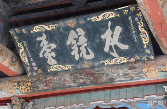 “水鏡臺”匾。水鏡臺是一座古戲臺,懸掛匾額“水鏡臺”?!八R”之名取自《漢書》名句“清水明鏡不可以形逃”,寓意為人世間的善惡忠奸盡人皆知。此匾由清乾隆翰林、著名書法家楊二酉所題,書體清秀,筆力遒勁。
