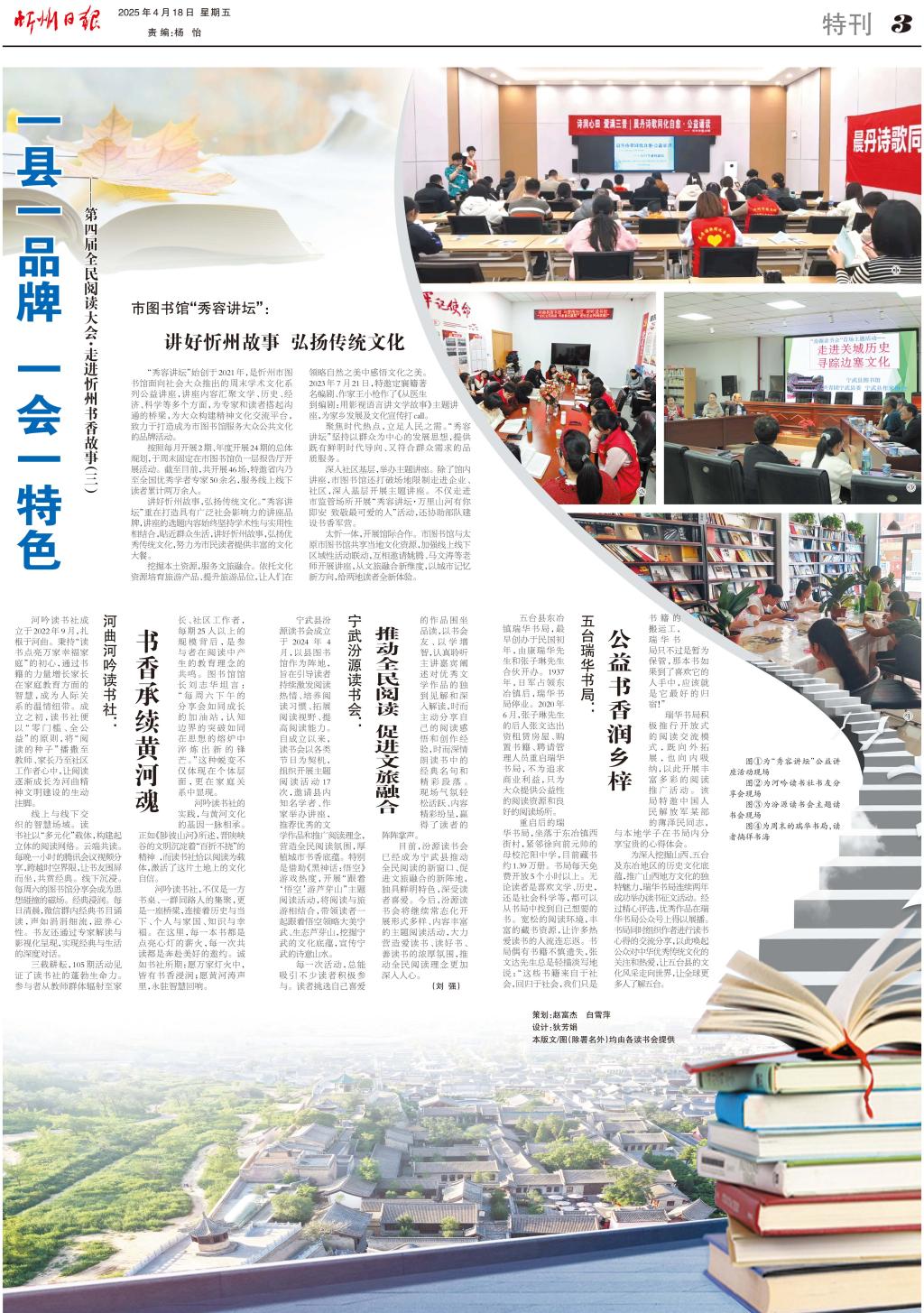 目前,汾源讀書會(huì)已經(jīng)成為寧武縣推動(dòng)全民閱讀的新窗口、促進(jìn)文旅融合的新陣地,獨(dú)具鮮明特色,深受讀者喜愛。今后,汾源讀書會(huì)將繼續(xù)常態(tài)化開展形式多樣、內(nèi)容豐富的主題閱讀活動(dòng),大力營造愛讀書、讀好書、善讀書的濃厚氛圍,推動(dòng)全民閱讀理念更加深入人心。(劉強(qiáng))